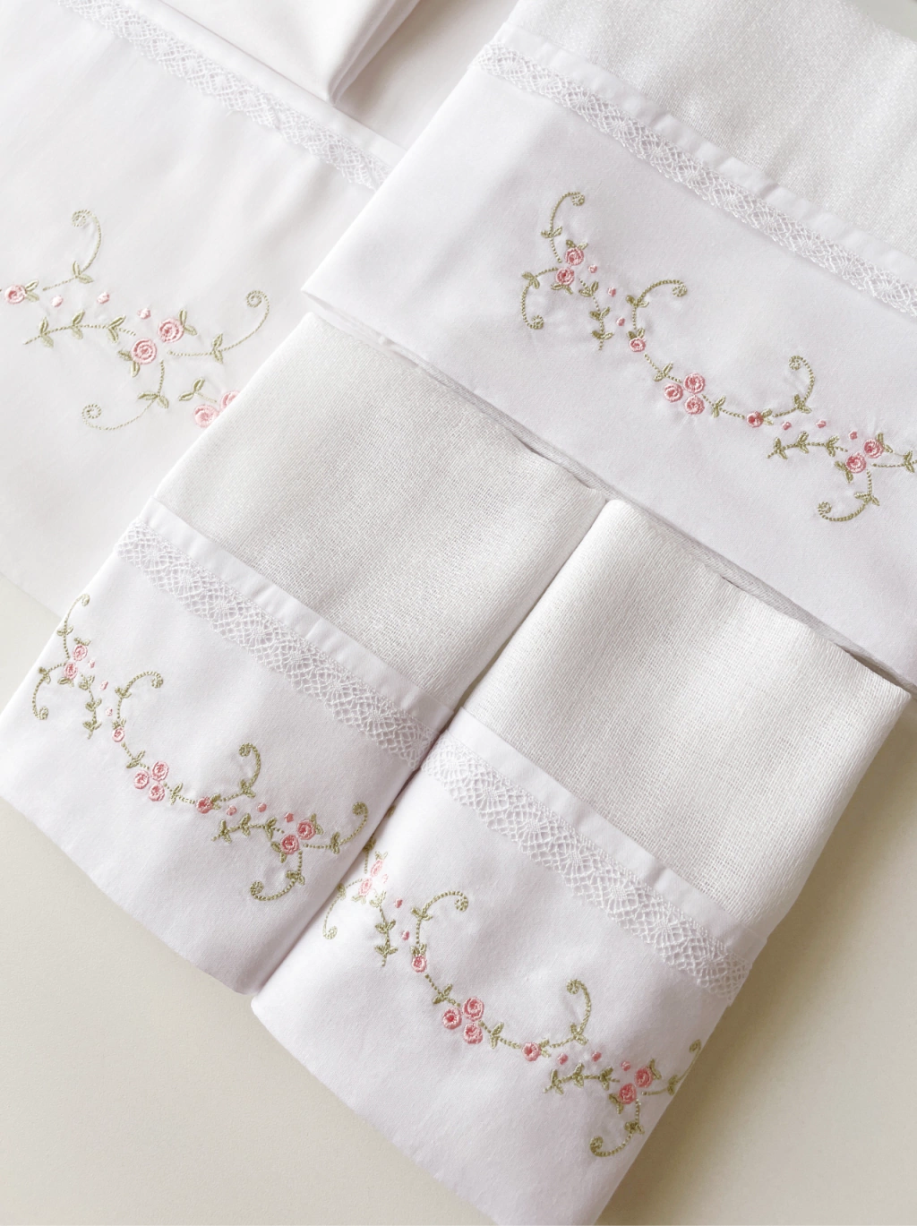 Combo do enxoval bordado Ramo de Rosas composto por 7 peças essenciais que devem fazer parte do enxoval de uso diário do seu bebê!